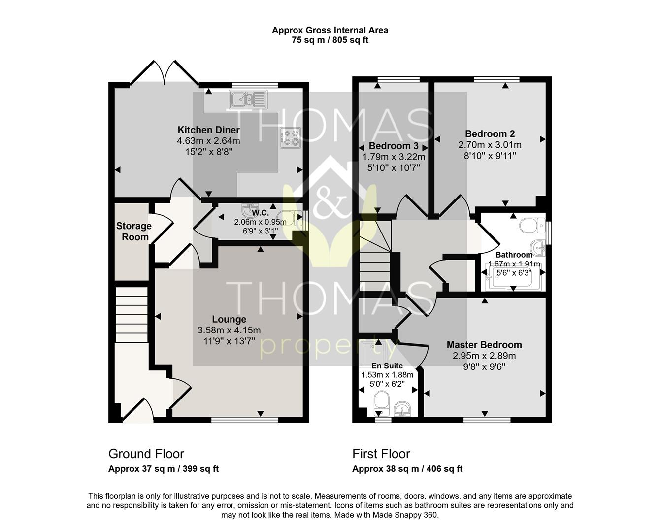 Upstairs are three well proportioned rooms, two of which are good sized doubles. The family bathroom is equipped with shower over bath and finally an en suite off the master, with standalone shower cubicle.