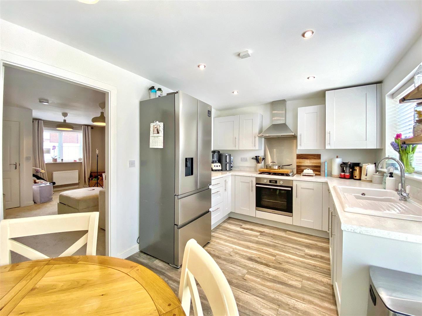 From the entrance hall, you are greeted by a spacious living room that overlooks the quiet close, providing a serene space for relaxation. The heart of the home is the fully fitted kitchen diner, which spans across the back of the property. This area is ideal for family gatherings and entertaining, with French doors that open directly into the low-maintenance garden, allowing for a seamless indoor-outdoor living experience.